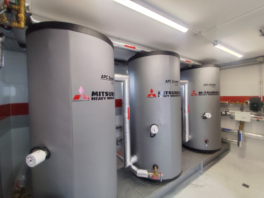 Wybrane zostały wysokotemperaturowe pompy ciepła marki Mitsubishi, Bosch oraz Viessmann, które pracują na naturalnych czynnikach chłodniczych przyjaznych dla środowiska, wspomagane istniejącą instalacją fotowoltaiczną minimalizującą zużycie energii elektrycznej. Zamontowane urządzenia zapewniają stałą dostawę ciepłej wody o temperaturze 55 0C i mogą pracować z pełną wydajnością nawet przy bardzo niskiej temperaturze zewnętrznej. Zbiorniki wody mają pojemność około 3 tysiące litrów. Instalacje funkcjonują od stycznia 2025 roku. Średni koszt podgrzania 1 m³ wody w ujęciu całorocznym wynosi 15 zł. Natomiast w miesiącach letnich, gdy produkcja energii z paneli fotowoltaicznych jest znacznie wyższa niż zimą, koszt ten spada do niecałych 5 zł, ponieważ większość energii potrzebnej do zasilania pomp ciepła pochodzi wówczas z instalacji PV. Natomiast w systemach wyposażonych w magazyny energii koszt podgrzania wody w miesiącach letnich spada praktycznie do 0 zł, ponieważ pompy ciepła są wówczas zasilane z własnych zasobów – w dzień z paneli PV a w nocy z naddatku energii zmagazynowanego w ciągu dnia.